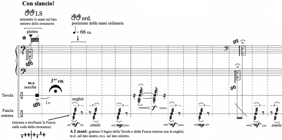 In my most recent works my research has focused on the possibility to make the abstract nature of sound visible and tactile, thus assigning great importance to the gesturality of the performer, who is given the task of giving life and form to a silent material dimension. The expressive power of gestures allows the sound to be seen, as well as heard, and the actual physical presence of the musical instruments acquires a very strong symbolic value similar to that of 17th century still life: it is a presence that shows man the possibility of surviving through art. In Wood-Metal-Strings the exploration of the actual material the instrument is made of, was determinant in the creation of a score that is like a sonic image strongly linked to the different ways of producing sound. The gesturality of the performer was a vivid source of inspiration, and the close observation enabled me to invent a vocabulary that was close to my vision and rich in semantic implications able to capture the attention of the eyes as well as the ears of the listener. At first I tried to have a receptive approach, working a great deal on the timbral characteristics of the different materials together with Emanuela Battigelli. The work was long and complex, but gradually the form came to the surface through sketches, drawings, recordings of sounds and the provisional creation of audio files accumulated during the rehearsals, allowing me to find an answer to the very strong need to be immersed in the sound of the instrument and to learn how to master a particularly rich and fertile material, giving it an almost “organic” form. The strings of the lowest register, dampened with felt, acquire a raucous voice that emits small fragments, nervous and tense, interrupted by brief and evanescent splashes of colour obtained by means of rapid glissandos on the strings of the high register. The ideas are repeated, constantly changing and are recognised by the memory of the listener, who is able to understand its identities, similarities and diversities. The obsessive rhythms of the short initial fragments is associated with different timbres, producing a sonic metamorphosis that involves dampened metal and gut strings, xylophonic sounds on the nylon strings and dense trills on the free strings in the medium-high register. The sounds produced on the strings blend with the constant presence of those produced on the wood of the instrument, sounds that suggest an auditory image linked to a puff of air, a breath, and that cover a very wide dynamic range: from the pianissimo of the soundboard stroked with the palm of the hand or rubbed with the finger tips, to the grating and biting sounds obtained by nervously scratching the surface with the finger nails. On listening to the piece, the sound of the traditional instrument present in the collective memory may prove unusual, but the intention was precisely to create an instrument that would suit my compositional thought of the moment and that, paraphrasing Helmut Lachenmann, could be “original”, being linked to the very roots of the person who produced it.